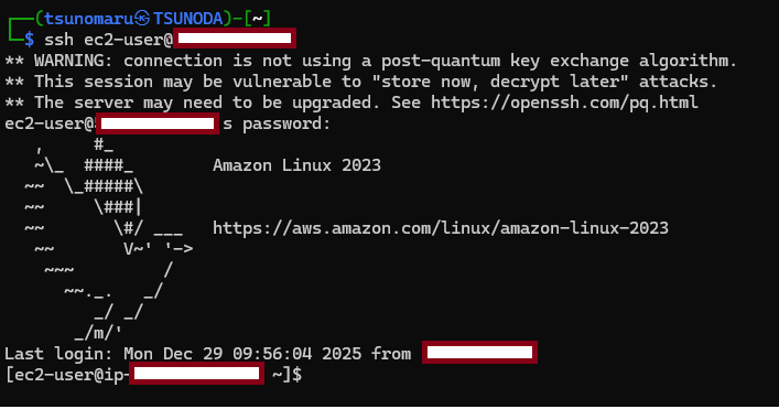 ssh ec2-user@<EC2のパブリックIP>以下のようにパスワード入力をしてSSH接続できれば成功です。
