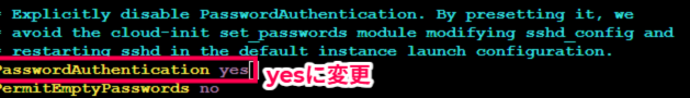 まず、SSHの設定ファイルを編集し、PasswordAuthenticationをyesにします。