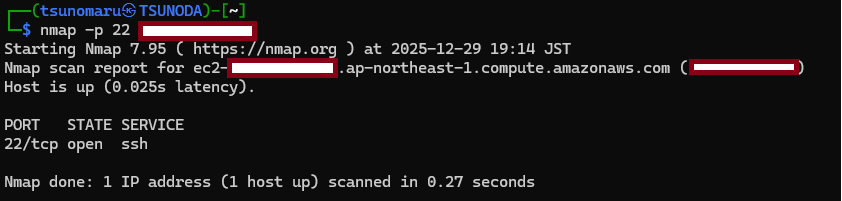 まず、Kali Linux からnmapを使用して対象のEC2 に対して、22番ポートが外部から到達可能か を確認します。